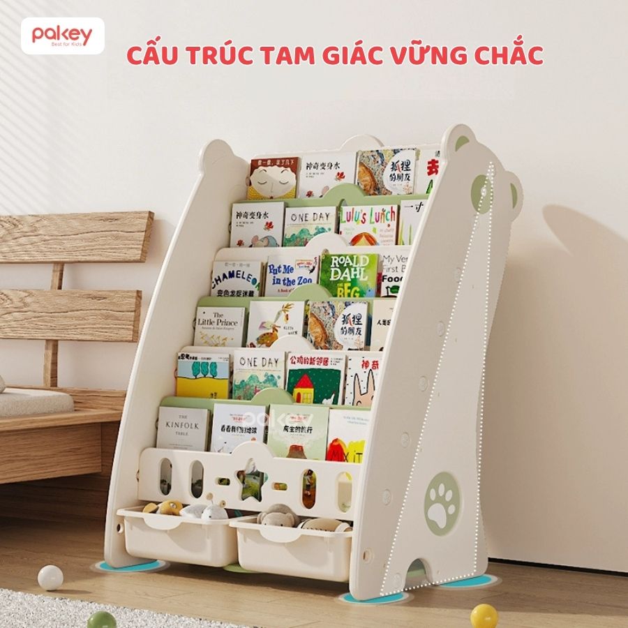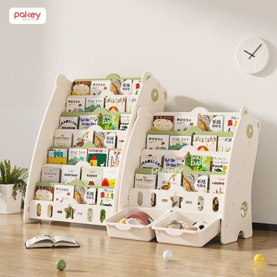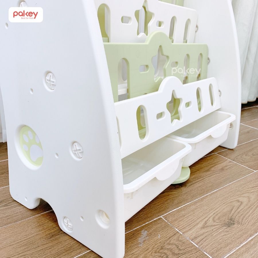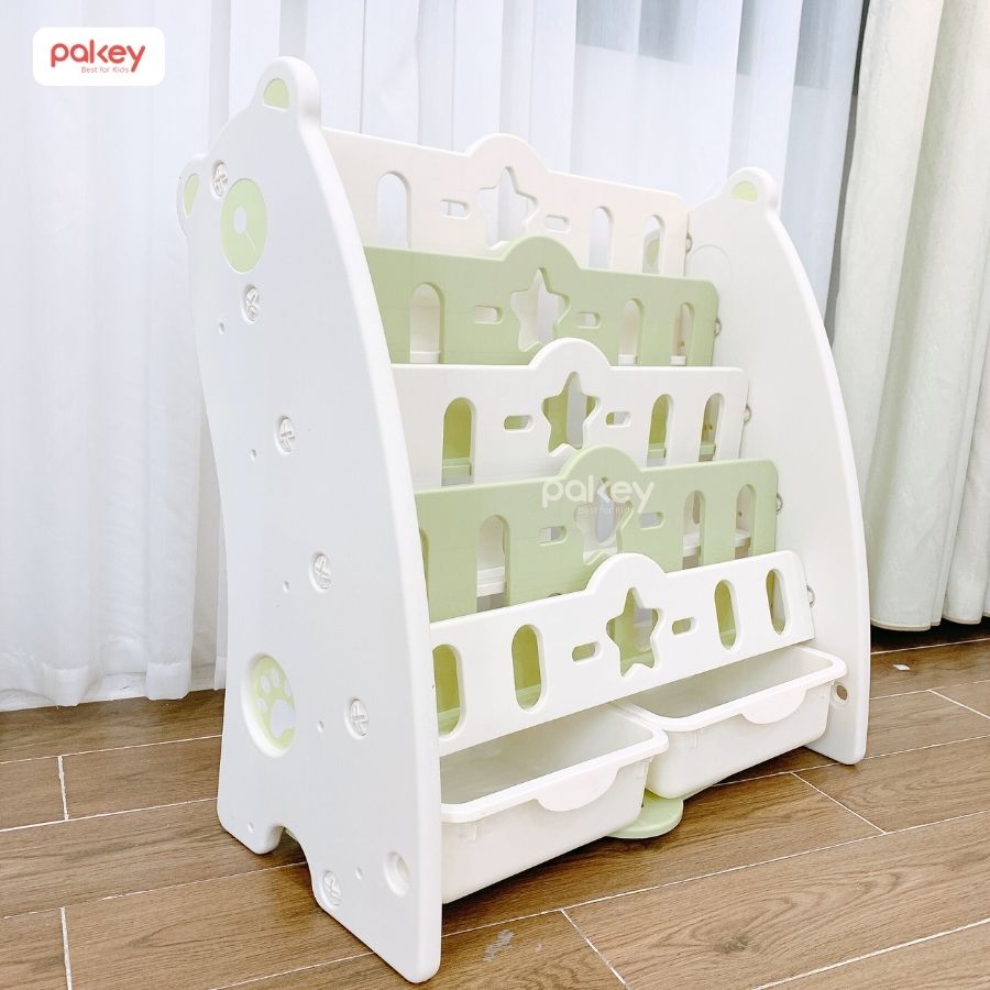 – Kệ sách gấu Pakey GS01 gồm 5 tầng, trong đó 4 tầng là kệ để đồ và 1 tầng cuối cùng được đi kèm với 2 chiếc hộc nhựa. Thiết kế này cho phép các bé có thể dùng để lưu trữ, sắp xếp nhiều loại vật dụng như: sách vở, đồ chơi, đồ dùng học tập,…