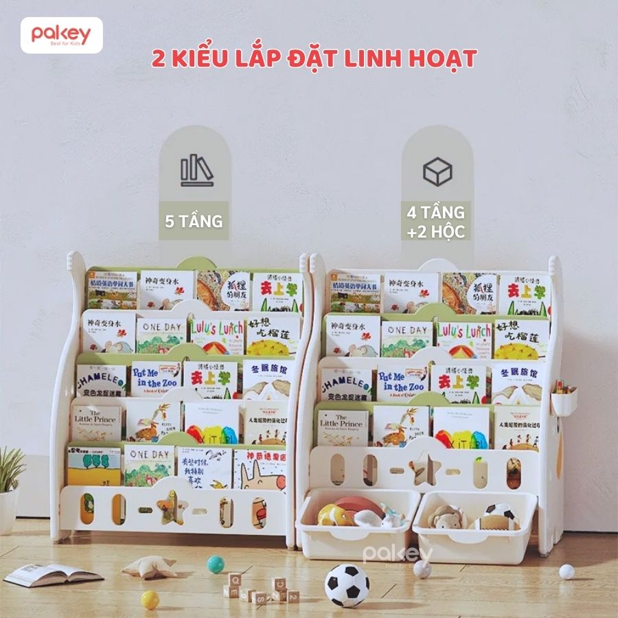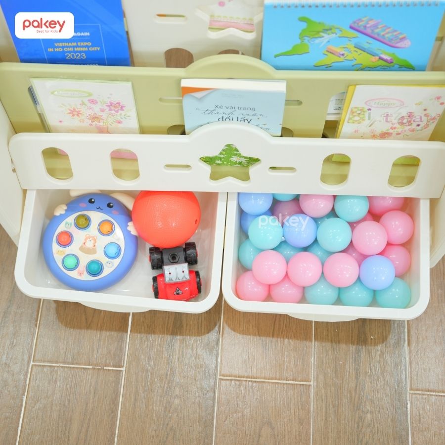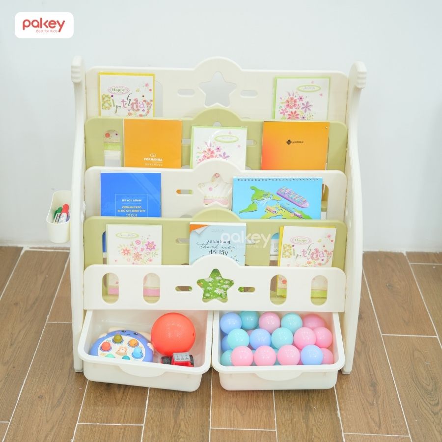 – Với 5 ngăn chứa và 2 hộc lớn đựng đồ ở ngăn dưới cùng, kệ sách Pakey Voi tạo ra không gian sắp xếp ngăn nắp sách vở và đồ chơi của bé.