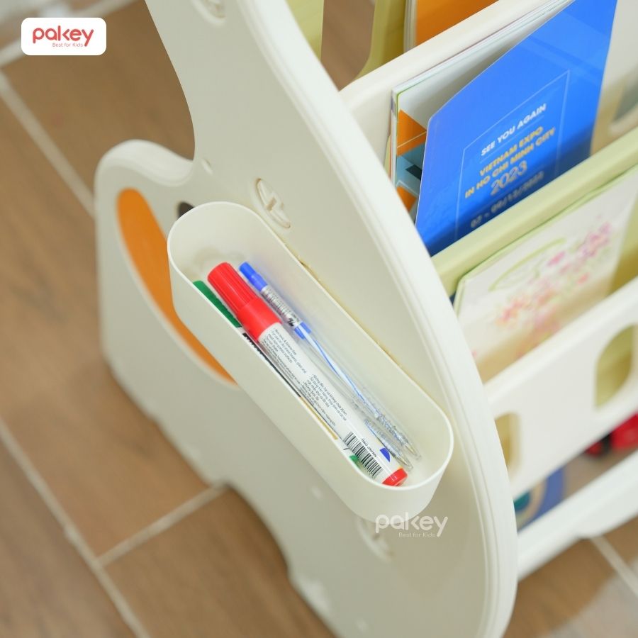 – Ngoài ra, phía ngoài thành của giá sách có hộp chứa bút màu cho bé thỏa sức vẽ tranh sáng tạo theo ý muốn.