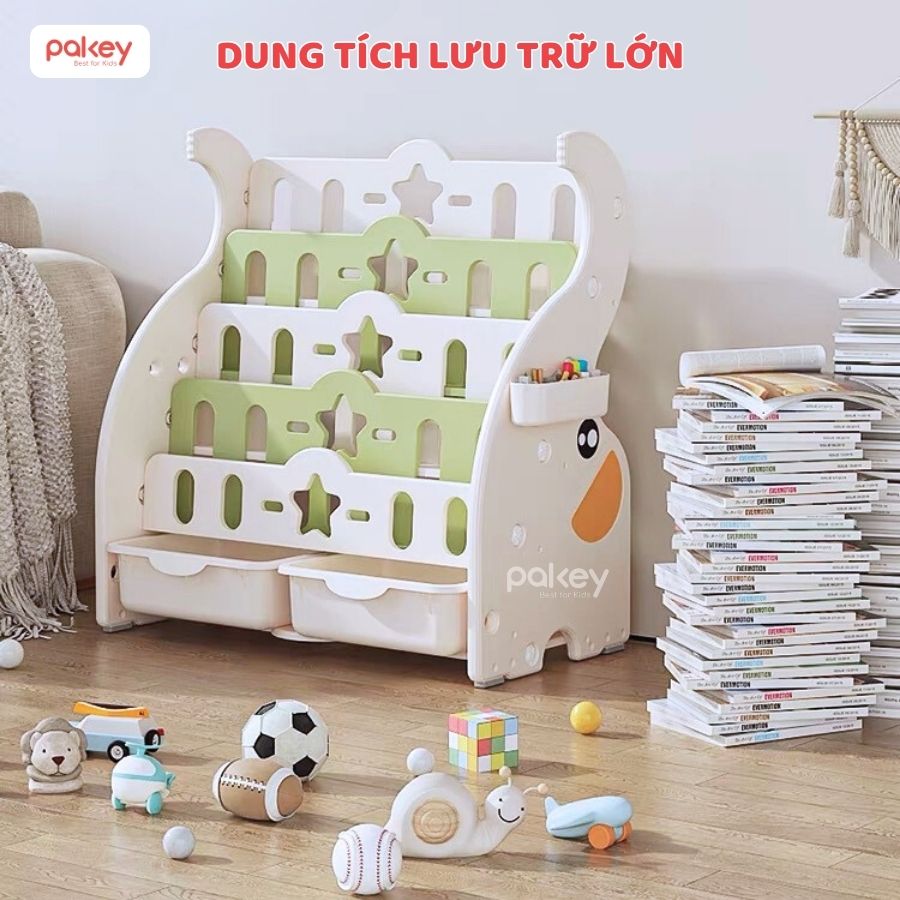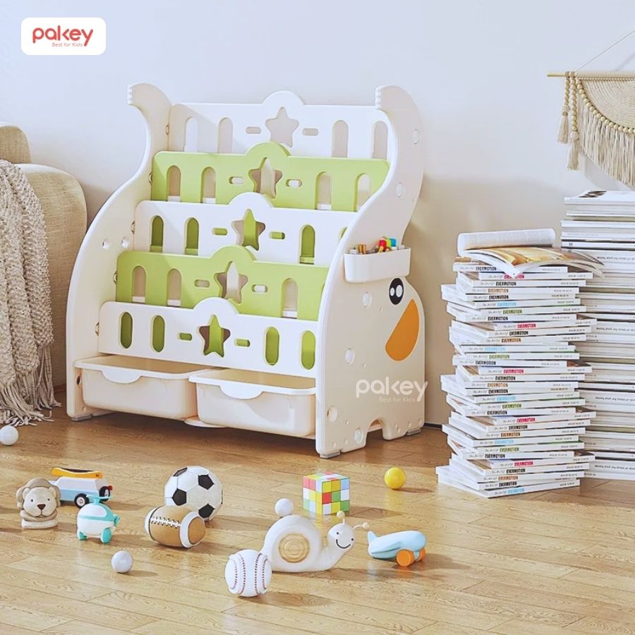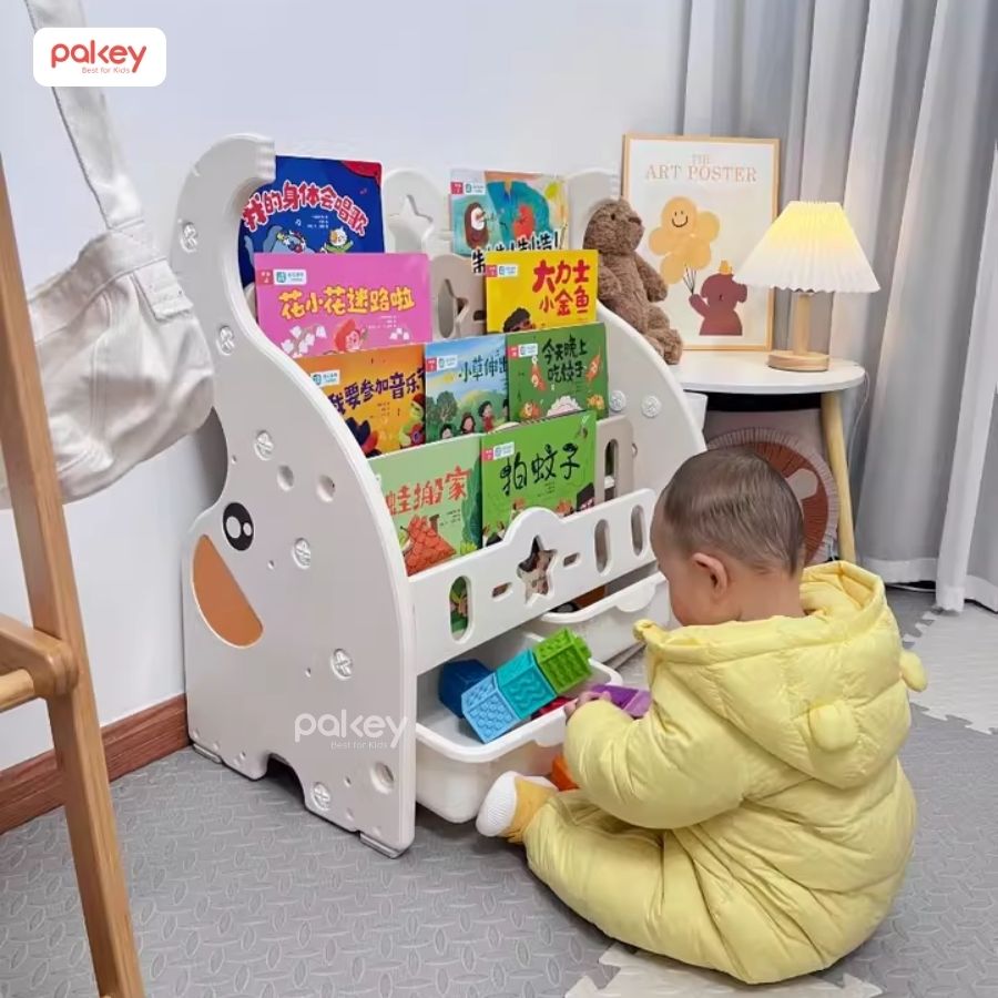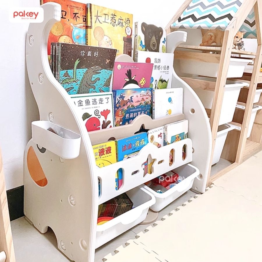 Kệ sách cho bé Pakey Voi nhiều tầng là công cụ giúp tạo ra một môi trường đọc sách tích cực và phát triển cho trẻ nhỏ. Với cấu trúc đa tầng kết hợp với 2 hộc lớn, sản phẩm không chỉ là nơi lý tưởng để tổ chức và lưu trữ sách mà còn nhiều đồ đạc khác của bé.