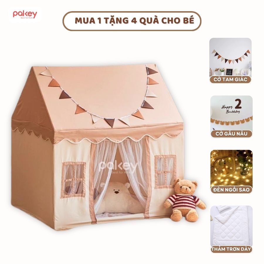 – Lều vải cho bé Pakey LV4 đi kèm với 4 loại quà tặng giúp ba mẹ trang trí không gian vui chơi cho bé trở nên sinh động và thoải mái hơn: cờ gấu, cờ tam giác, đèn led, thảm.