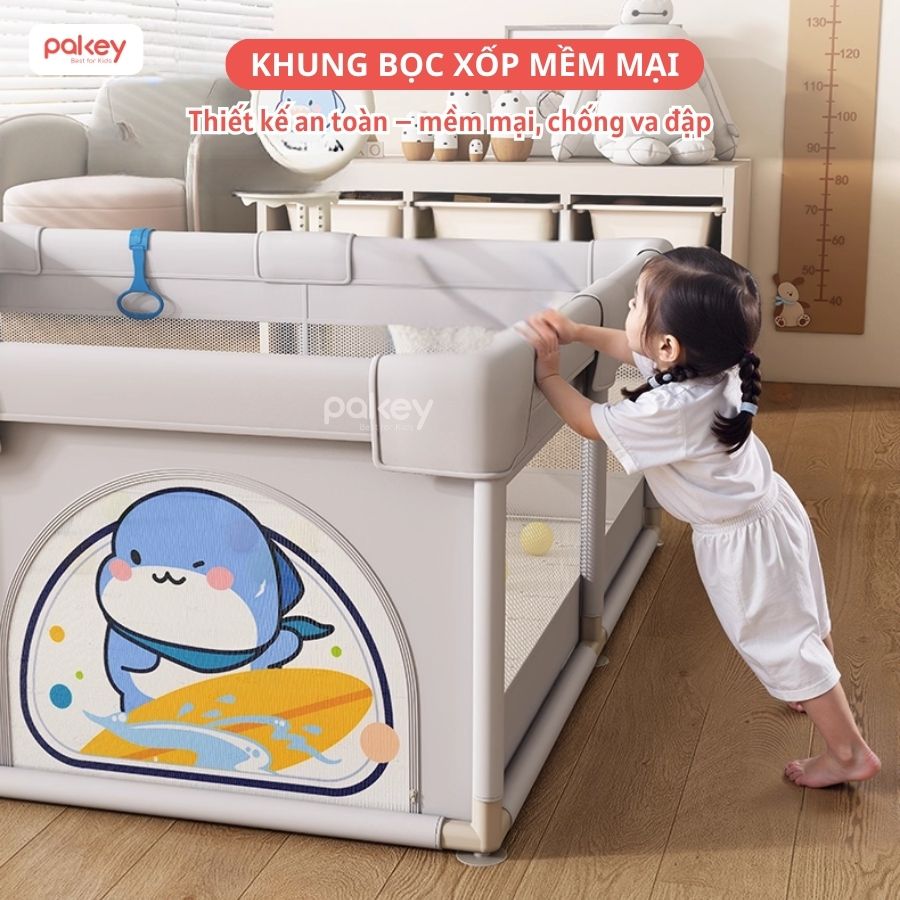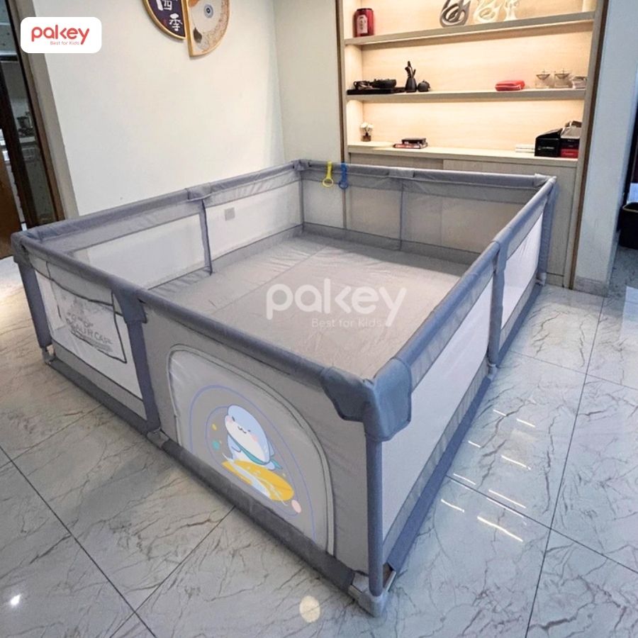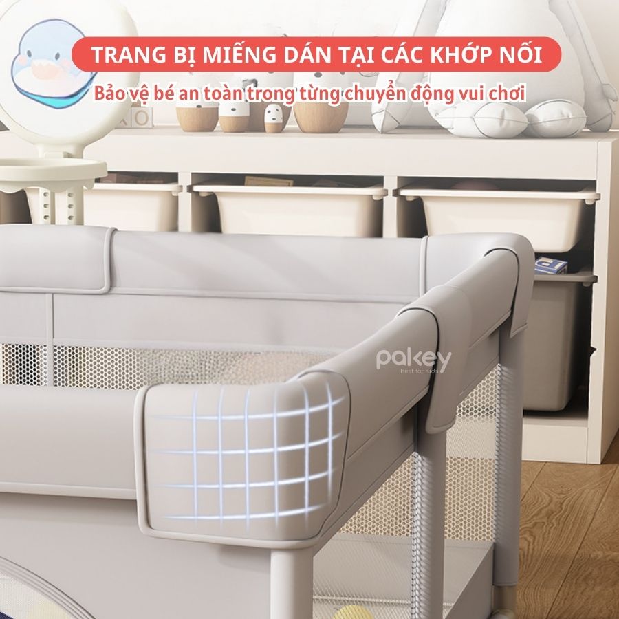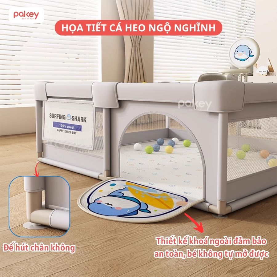 – Cửa quây được thiết kế khoá kéo từ bên ngoài, đảm bảo bé không thể tự ý mở ra. Mọi góc cạnh đều được bọc xốp mềm mại – vừa êm ái khi chạm vào, vừa bảo vệ bé an toàn trong từng chuyển động vui chơi.