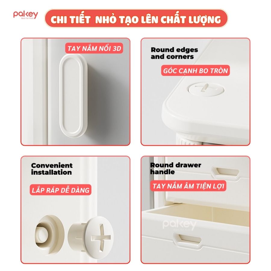 – Các góc cạnh của tủ được bo tròn kỹ lưỡng, giảm thiểu nguy cơ va chạm và làm tổn thương cho bé khi chơi gần tủ.