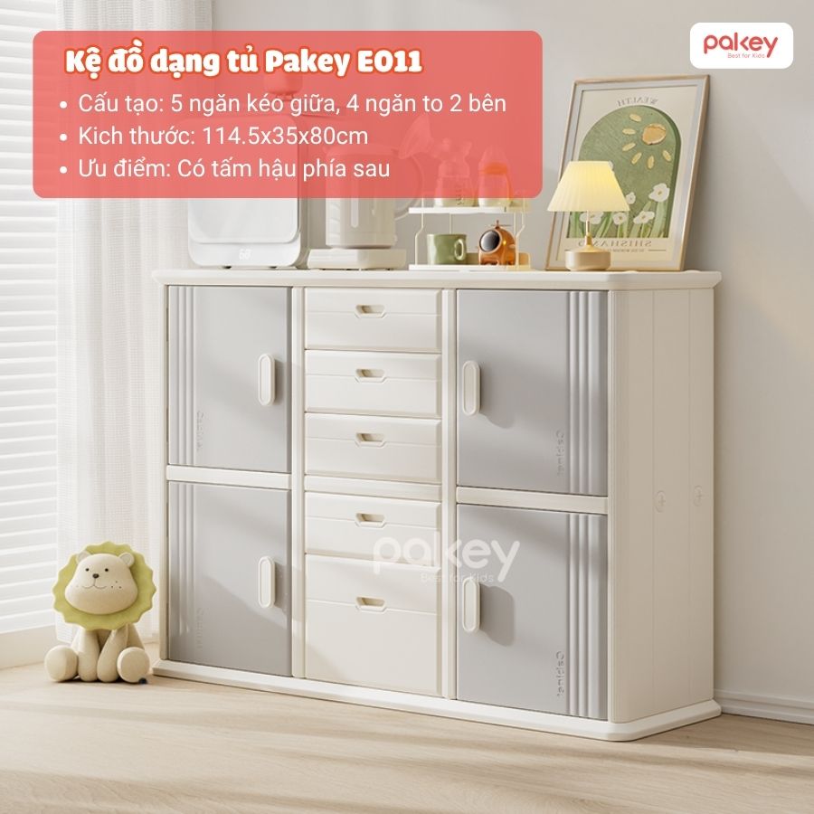 E011 là mẫu tủ kệ đa năng độc quyền của thương hiệu Pakey, dẫn đầu về số lượng bán ra trên thị trường. Sản phẩm gây ấn tượng với thiết kế tối giản nhưng vẫn sang trọng, chất liệu nhựa nguyên sinh dày dặn, cao cấp.
